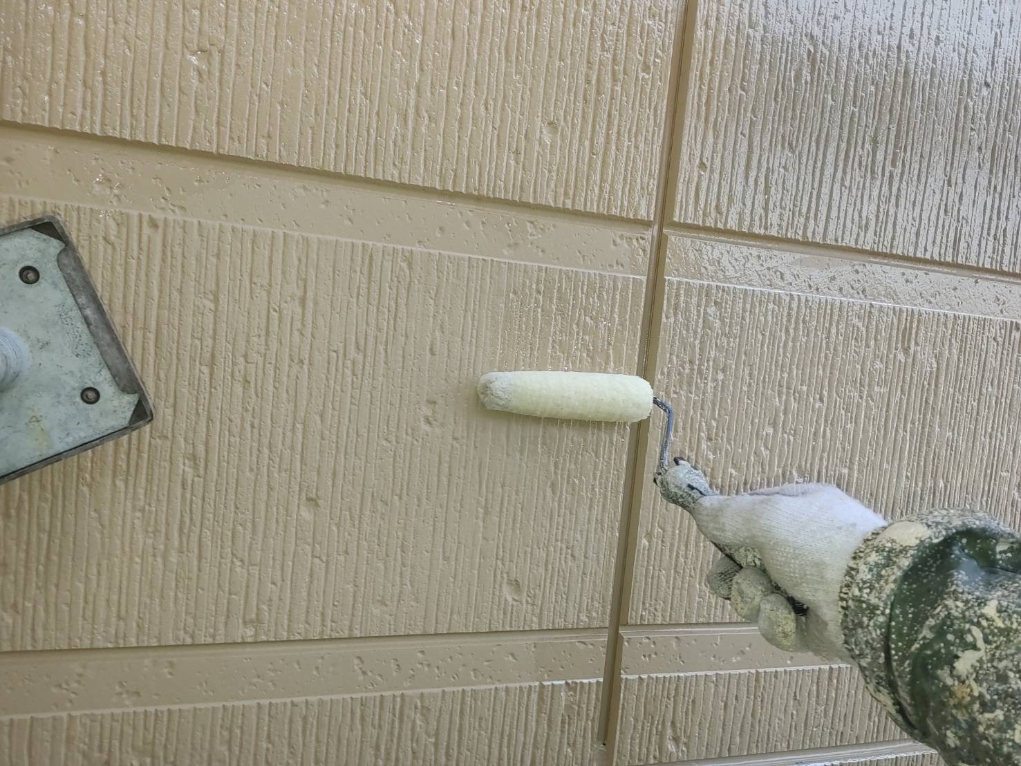 外壁塗装です。下塗り中塗り上塗りの3層仕上げで仕上げていきます。今回の塗料は無機系塗料グランセラトップです。